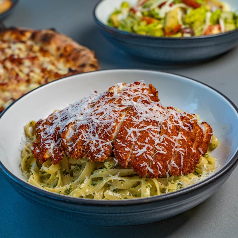 Rigatoni, vodka sauce, English peas, pecorino, chicken cutlet.