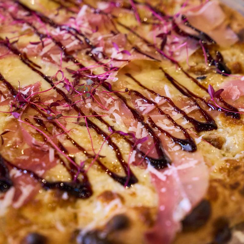 Fresh mozzarella, gorgonzola, fig jam, prosciutto, arugula, balsamic reduction.