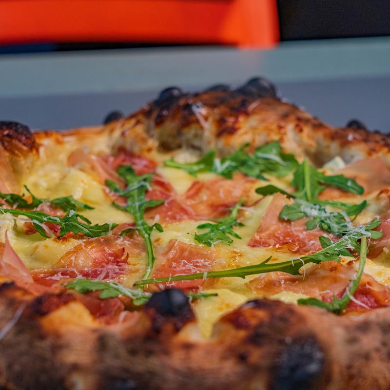 Fresh mozzarella, Pecorino, ricotta cheese, hot honey, arugula, prosciutto.