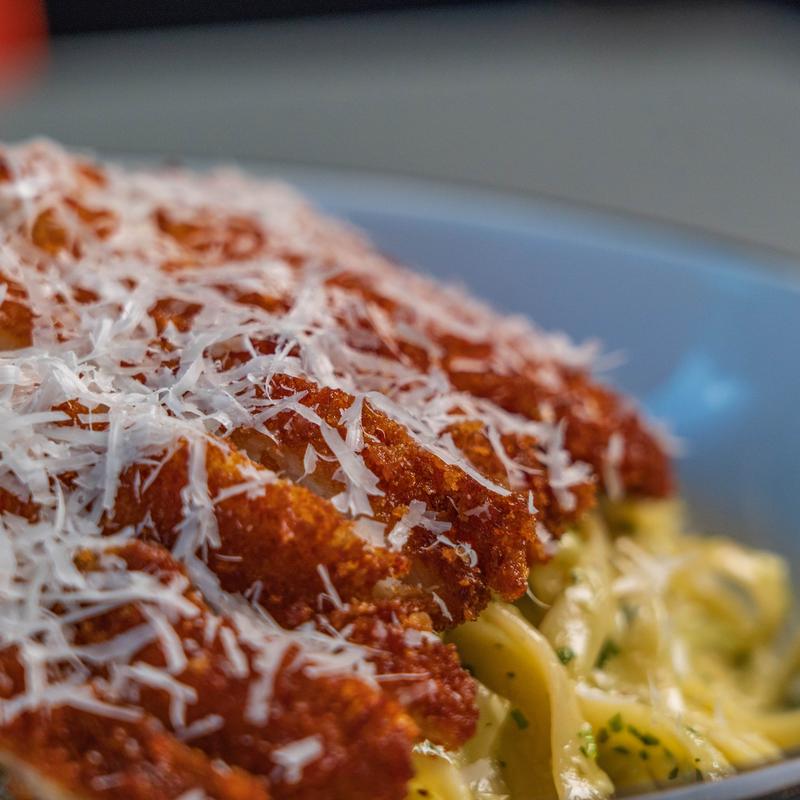 Fettuccini, pistachio pesto, pecorino, fresh mozzarella, chicken cutlet.
